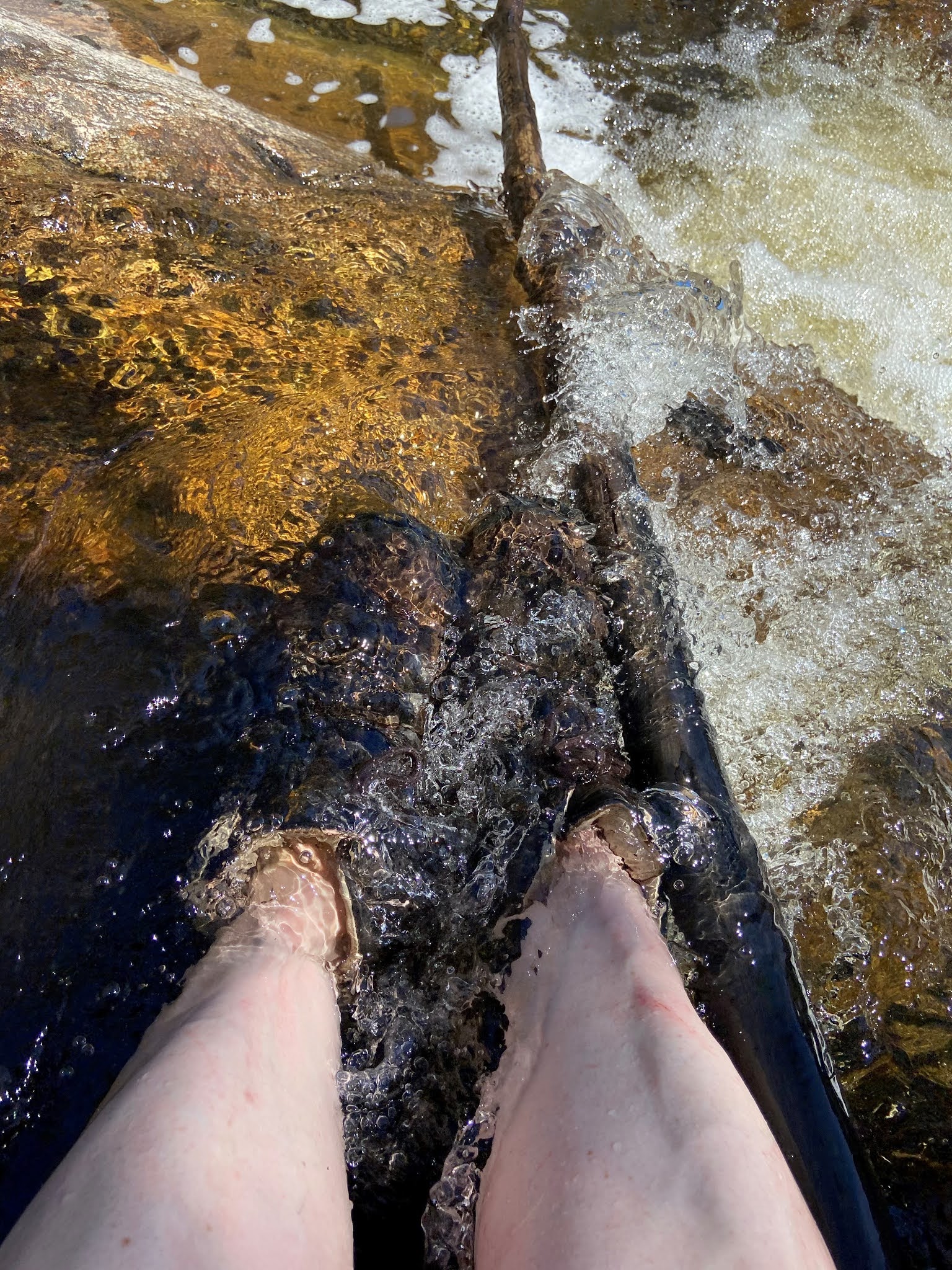 Etter en liten stund går vi ned igjen. Og nå stopper vi ved Svaet og bader! Ikke i den digre kulpen, nei....vi kjøler oss ned i en liten sidebekk, og de små pyttene er deilige å kjøle seg ned i. Elven kjøler ned de varme kroppene våre med glitterdusjer, og livet er bare herlig. Barna er venner og leker, og jeg får nyte livet på det flate fjellet. Heldige meg!